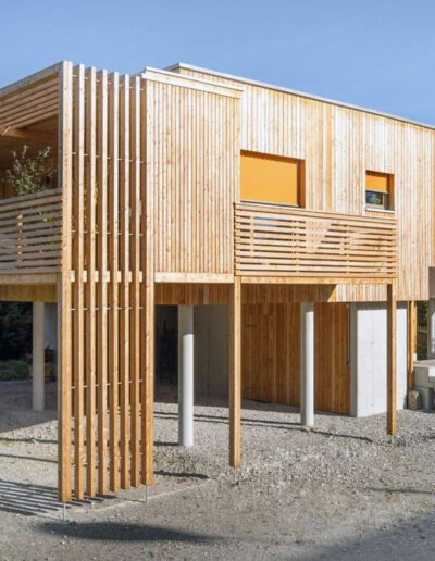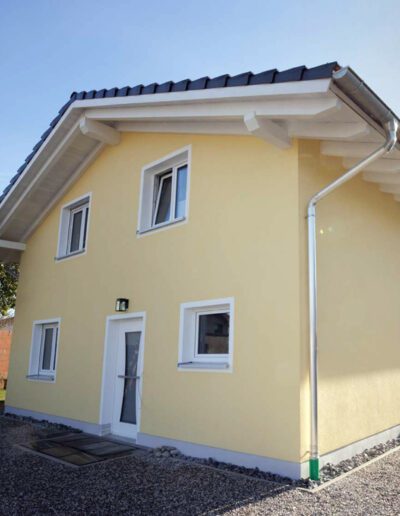 Bauart: Keller, Bodenplatte und Außentreppe in Stahlbetonbauweise, Rest in Holzständerbauweise