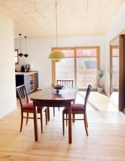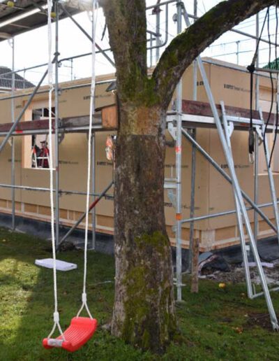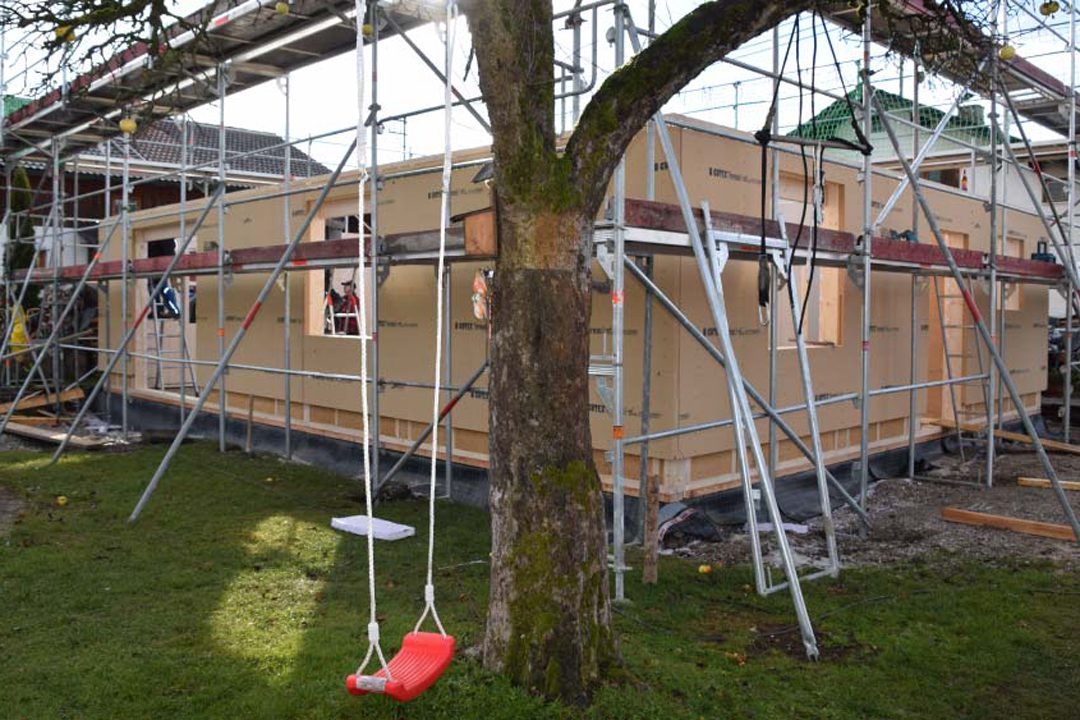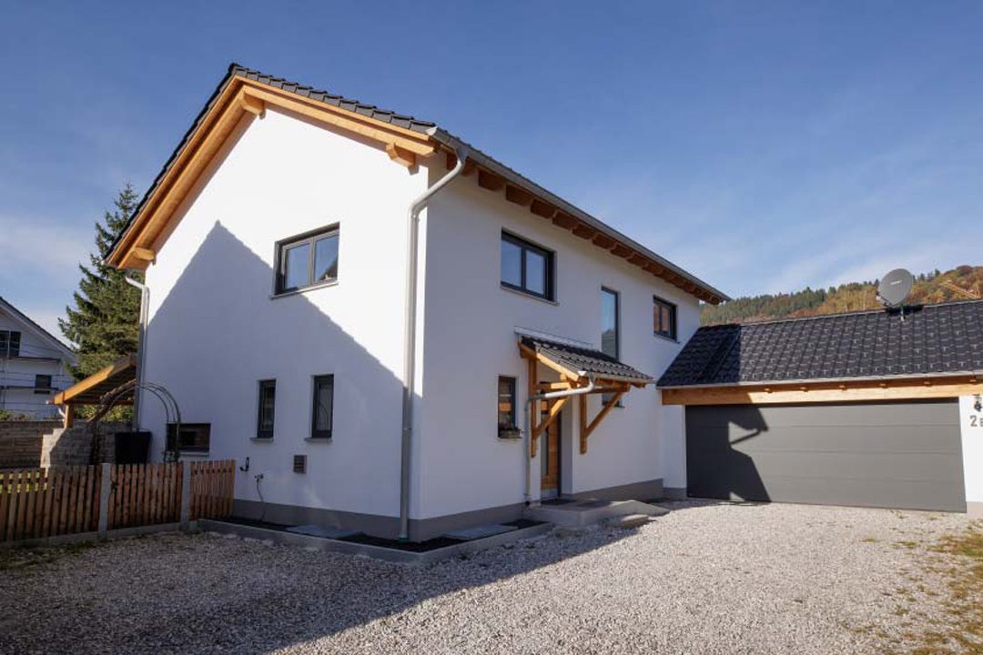 Bauart: Bodenplatte und ein Teil der Wände im EG in Stahlbetonbauweise, da das Haus am Hang steht, Rest in Holzständerbauweise